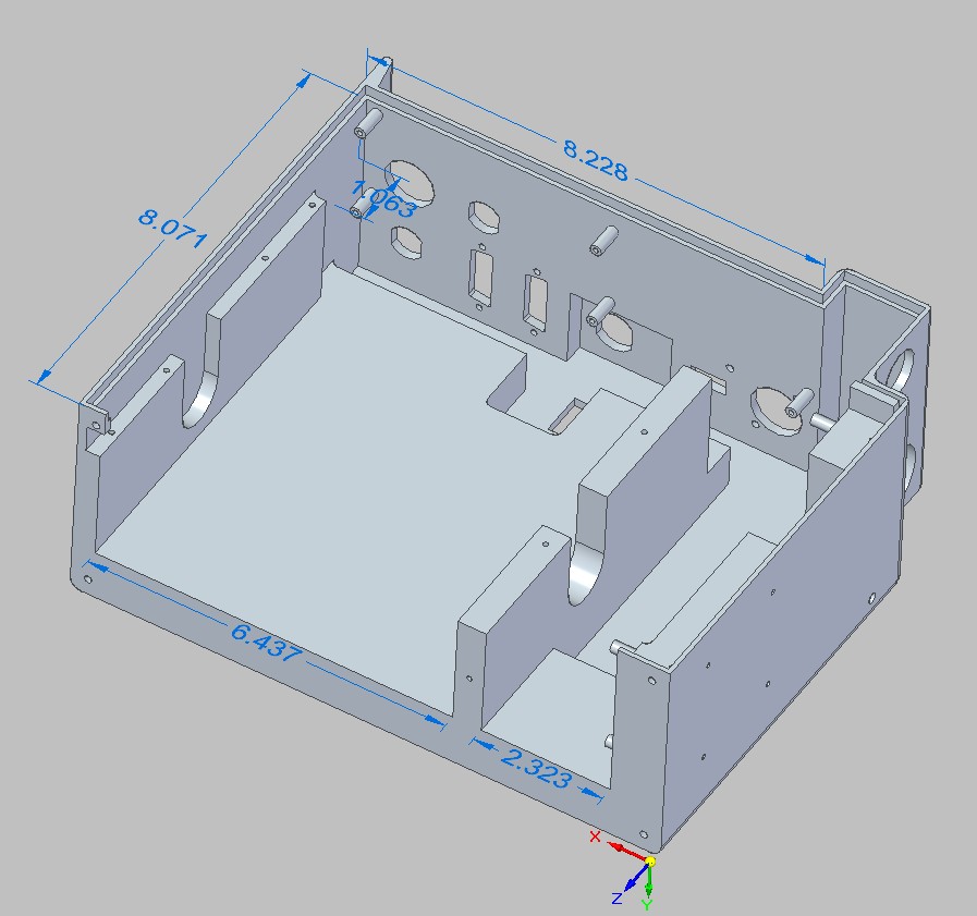I am sure that all the plugin connections were dimensionally correct and that sufficient space in the “box” was allowed for components according to precise sizes garnered from somewhere. The problem is however that this designer had absolutely no idea of what is required to allow for milling this kind of part. First off this is impossible to mill unless done as four or five pieces that would be assembled with fasteners or perhaps welding. It could be done with some of those new fancy metal powder deposition laser doo-dads. Except for the problem of how to tap occluded holes in some of the round bosses I think it would be possible there. But then again this would never yield quick or cheap parts for something that was to be mass manufactured. You could afford to make one this way if it was to be used as a pattern for molding. But then you would have to drill and tap those holes on those bosses on every casting and quite frankly I don’t know a way that this would be possible except with a through hole which is not indicated based on the part file. In any case I am not familiar enough with casting to know if this is a feasible design.