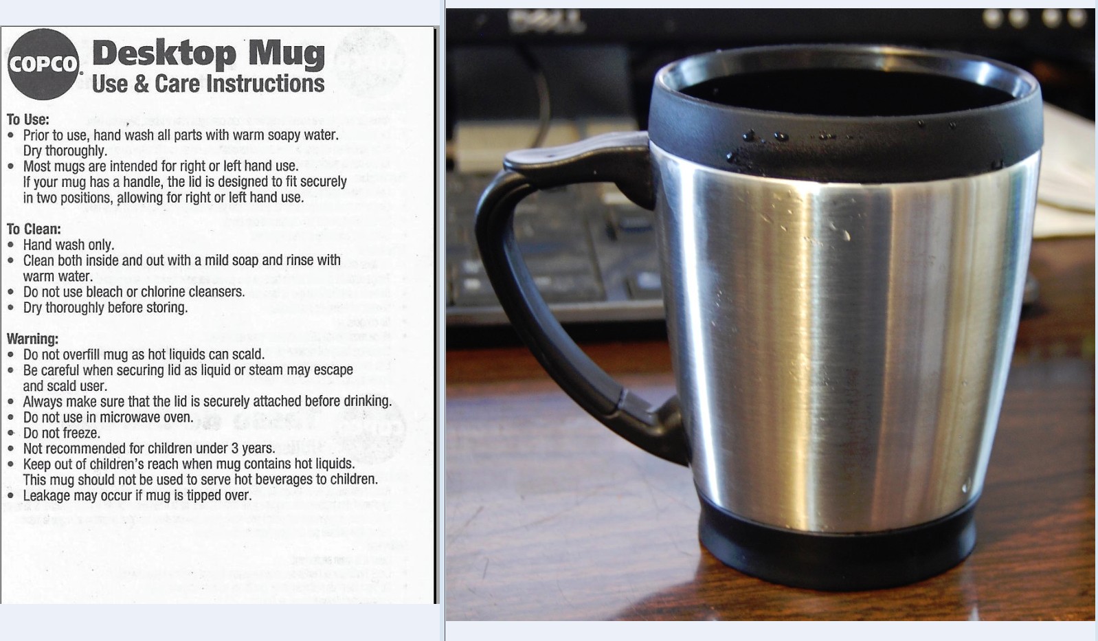 There are times where you buy a consumer product that is so complete so innovative and so revolutionary in design that you are compelled to regard the genius behind such a thing in wonder. Here we have a common, well at least I thought it was commonplace item in most houses and many vehicles. A utilitarian device meant for both hot and cold climes and contents supremely purposed for YOUR satisfaction. Howdja like that PR and Marketing bit of babble speak there eh? At least I did not and nor did these wonder purposed universal utilitarian hot or cold multi-delivery enhanced designed containers purveyors state 200% increase over your current whatever. Be grateful for the small things in life which can mean so much when you are spared them. Ready to see this wonder of technology? Hint, it comes with a convertible handle and content containment device that will automatically work with the handles detente that allows for right or left hand use. Apparently there may be a third hand or perhaps even more ways too but I presume they have not fully developed a market yet for this and so just two hands are mentioned at this time. Please note that the picture shows the device in it’s left handle detente position.