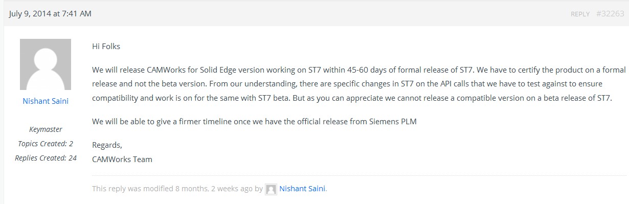 Here is the only comment given by Geometric regarding this ST7 release. Not one single comment since then and not one tiny expression of concern from Geometric about us anywhere. Nishant and the chief developer Vivak have time however to go to trade shows and talk about CAMWorks new machine verification this last couple of weeks. Buy us out Geometric. Refund our money and just shut it down. It is clear you don’t know what you are doing and furthermore don’t care. Your actions speak far louder than your lack of words. I had to laugh a bit as Nishant said below that they had to wait for the official release of ST7 before they could do serious work. This backs up my idea that there is no proper communication going on as Geometric should have been involved all along and working with SE as ST7 was being developed. The word incompetent for some reason is in my mind right now.