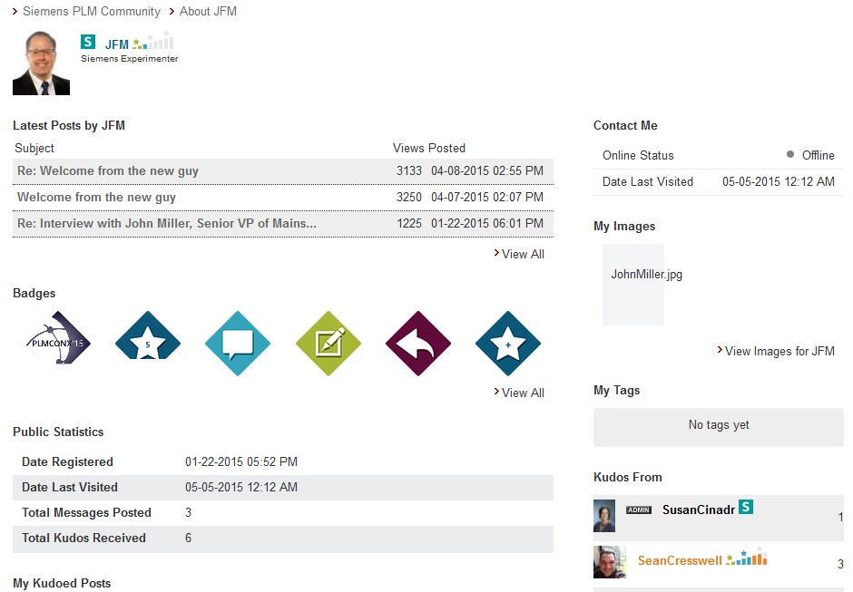 How about that new guy Siemens has for SE. What a spark plug and whirling dervish of Solid Edge enthusiasm he is. OK so you don’t know who he is and I am not surprised since he does not have a vision and a desire to communicate. The only public commentary supposedly by him on the Siemens SE forum or indeed anywhere else since he became Siemens place holder for the position was written for him. He did not write and evidently had no desire to do so. The Publicity and marketing idiots over there felt they had to do something anyway since Mr New Big Guy did not care to and they wrote for him and posted it. Here it is and note the badges earned by this guy. Register and write once and respond once and you get this.