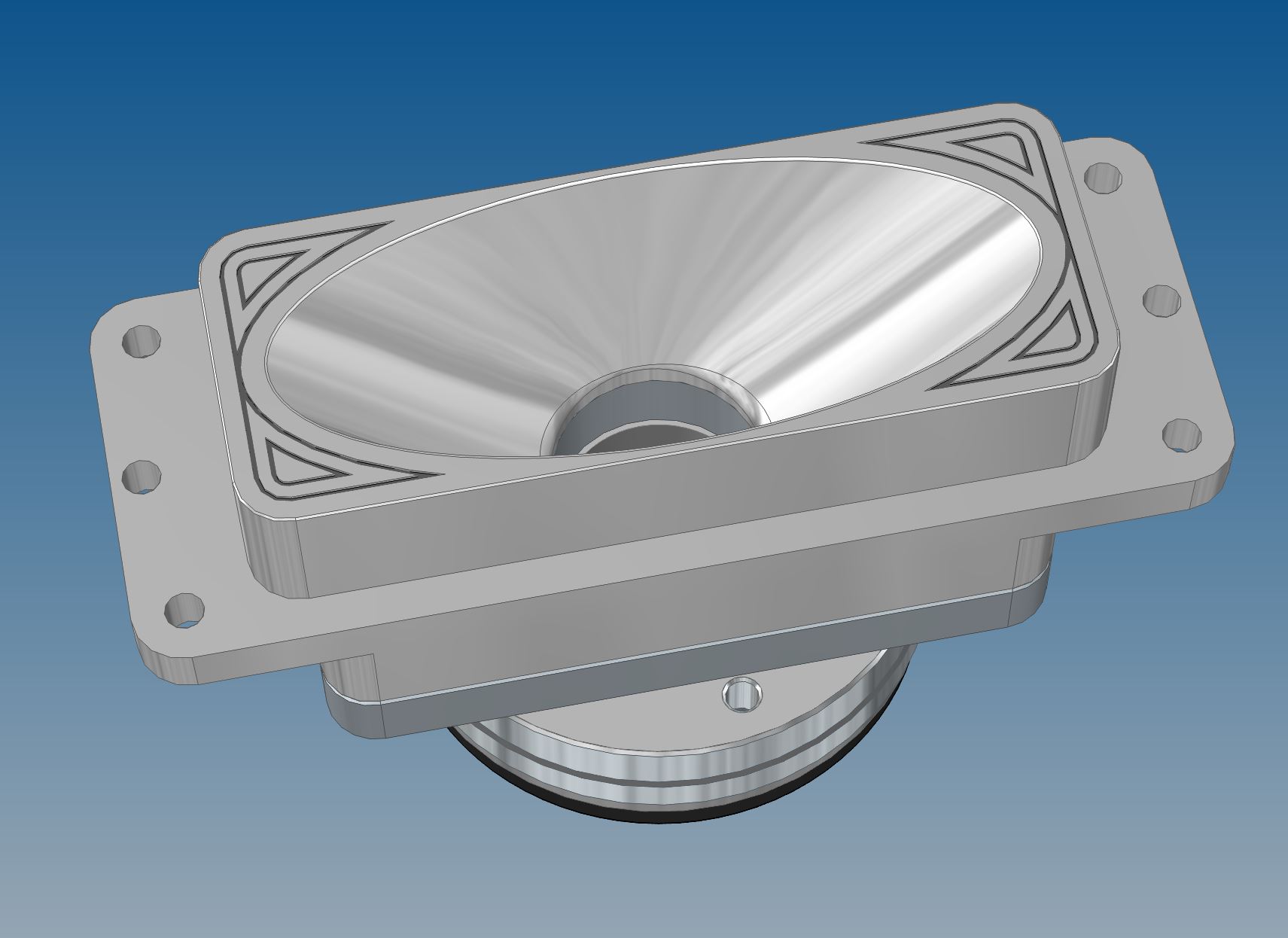 I ended up with two horn lens types and a modular base plate that would allow for the horn lens to use either the common 1 3/8 18TPI threaded driver or a two bolt driver like the B&C DE110 or DE120. All final tweaking has been done and I will begin selling these the last week of May. Here are some screen captures of the assemblies from Solid Edge which they were designed in. Basic dimensions first and then the two types of horns which are the Elliptical and Tractix style.