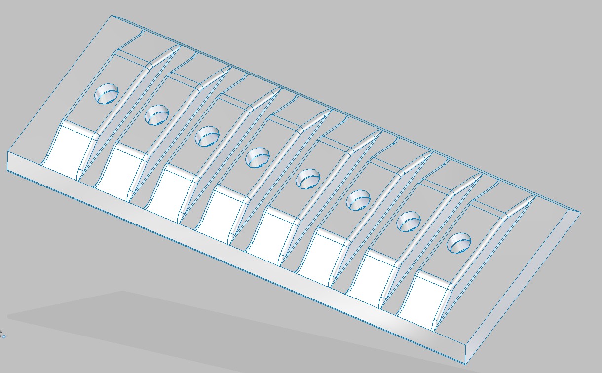 The other paradigm is to use Templates as programs like ZW3D and HSM do. I have just started using templates with HSM and since the “hole wizard” is not complete yet my understanding is that templates will work well with only 3D shapes right now. The part I did this morning was the above one and taking a similar part with five oval holes instead of eight round ones worked by merely using the template and regenerating the tool path. I did not have to pick anything or any feature to create a complete adaptive tool path for the top side. Still a lot of work to do here though to be able to save a template for a complete part. With the wide variance of parts I cut the speed of initial tool path generation is the biggest deal for me and while AFR and templates are interesting I still prefer to just knock the tool path out quick and be done.
