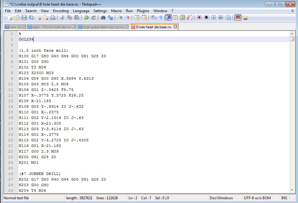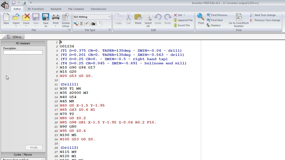In comparison Inventor HSM (I-HSM) and HSMWorks have included an editor with every version along with gobs of posts for free. Here is some output code and note also the inclusion of tools used right at the start. A quick glance at the tool list and the tool carousel can save real grief and the real editor is quite useful.